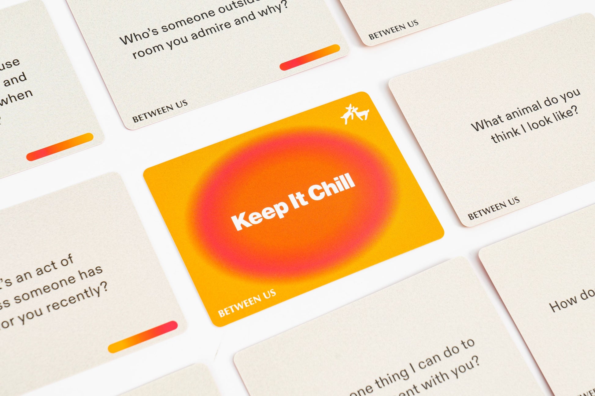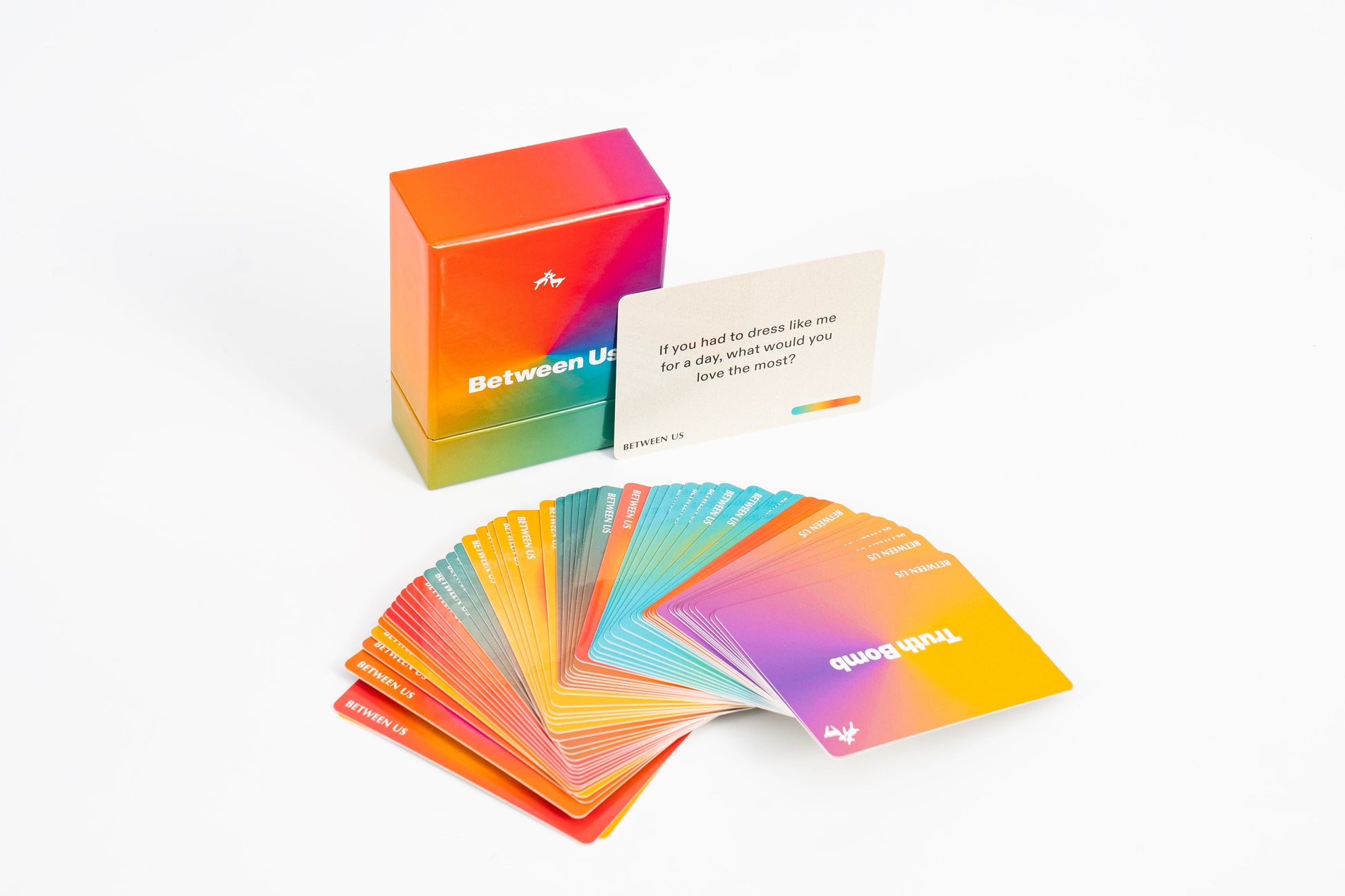 Between Us is a conversation card game made for parents and teens to help you reconnect, laugh, and actually talk — without the awkwardness. Each card is a simple prompt or challenge designed to open up meaningful (and sometimes hilarious) conversations at home, in the car, or around the dinner table.